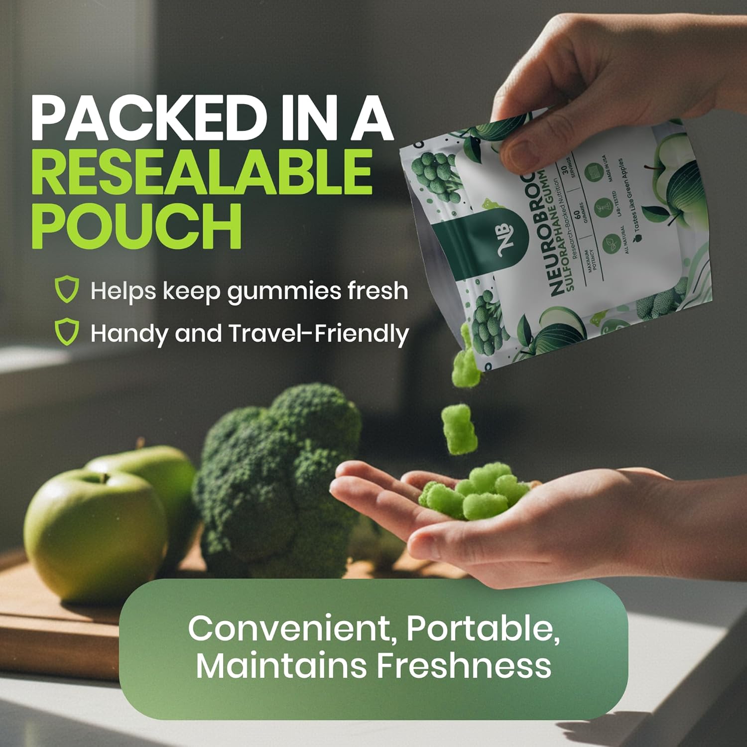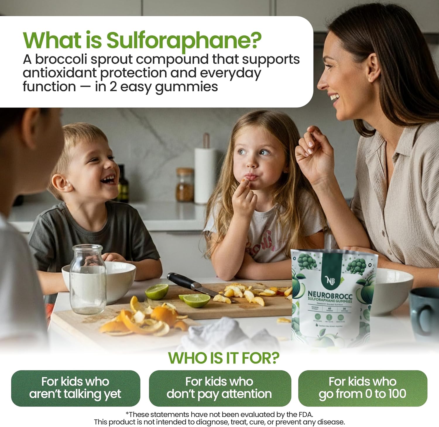 We love broccoli! But there are a few challenges: First, your child would needto eat about 2 pounds of broccoli every single day to get the sulforaphaneequivalent to two NeuroBrocc gummies. (If your child willingly eats thatmuch broccoli daily, please tell us your secret!)